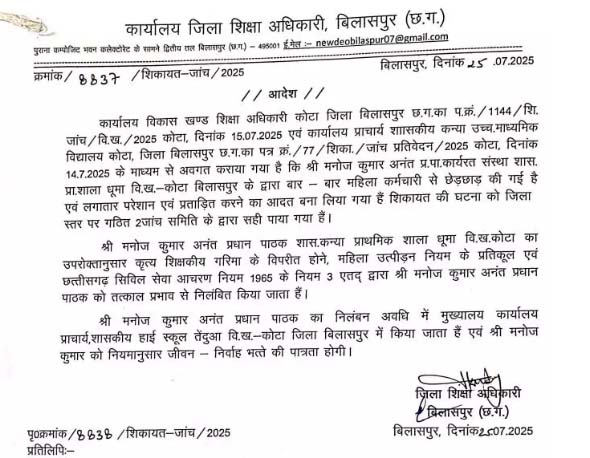 बिलासपुर। जिले के कोटा विकासखंड अंतर्गत प्राथमिक शाला धूमा में पदस्थ प्रधान पाठक मनोज कुमार अनंत को जिला शिक्षा अधिकारी ने निलंबित कर दिया है। आरोप है कि प्रधान पाठक मनोज कुमार अनंत के द्वारा स्कूल में पदस्थ एक महिला कर्मचारी को लगातार प्रताड़ित किया जा रहा था। महिला कर्मचारी के साथ छेड़खानी भी की जा रही थी। महिला कर्मचारी ने इसकी शिकायत की थी।